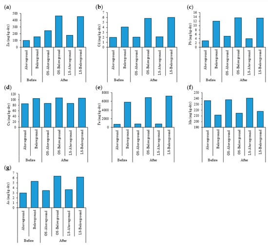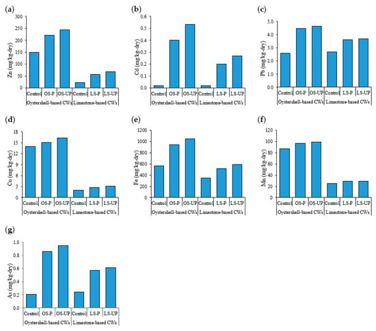 Accumulation of heavy metals in cattails in oyster shell (OS)/limestone (LS)-based CWs before and after 7-month AMD treatment: Zn (a), Cd (b), Pb (c), Cu (d), Fe (e), Mn (f), and As (g).