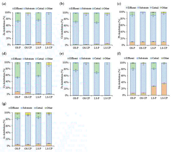 After the 7-month operation, the total Zn, Cd, Cu, Pb, Fe, Mn, and As accumulation values in the plant biomass were 48.72, 0.30, 2.17, 0.44, 230.40, 4.74, and 0.24 mg in the OS-P CW, respectively, and 45.00, 0.33, 2.03, 0.40, 286.94, 4.83, and 0.22 mg in the LS-P CW.