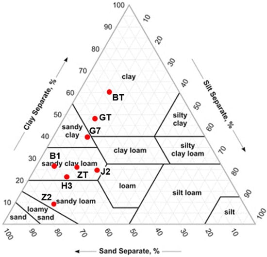 Results of particle size analysis are reported in the triangular diagram of soil texture (Figure 2). They show that sand and clay are more abundant than the silt fraction (less than 25%) in all samples. All contaminated soil samples are dominated by sandy textures, going from sandy loam (Z2) to sandy clay loam (H3, J2, B1) and even to sandy clay (G7). It should be noted, however, that the textures of the control soils from Jebal Ghozlane and Bouaouane (GT, BT) are close to those of the contaminated samples from the respective mine sites (G7, B1), with the exception of soils from Bouaouane, for which the clay texture of the control sample (BT) is very different from the contaminated one (B1).