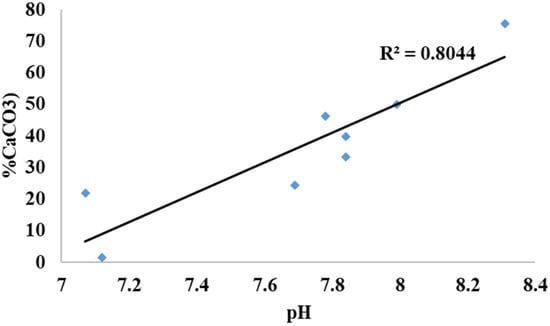 Relationship between soil pH and CaCO3 concentrations in the studied soils.