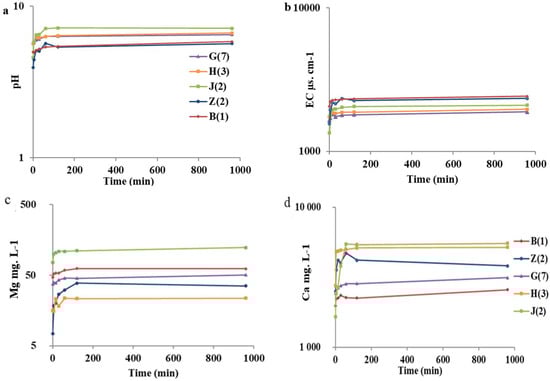 Ca. Ca concentrations show a rapid increase at the beginning of the test up to a maximum and then stabilize with very little variation until the end of the test (Figure 4d). This increase follows the same pattern as Mg and pH. The highest concentrations of calcium were found for samples J2 (5520 mg·L−1) and H3 (5169 mg·L−1) from Jalta and Djebel Hallouf, respectively. These concentrations reflect the soils’ mineralogy, since the soil of Jebel Hallouf contains the highest amount of calcite, while the Jalta soil, although poor in calcite, contains dolomite and gypsum.