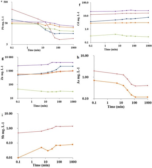 Based on the leaching experiment results (Figure 3), we observed that metals and metalloids behave differently during the extraction test. PTE concentrations were well above the permissible limit in surface water according to [55] (As < 0.01 mg·L−1 and Sb < 0.02 mg·L−1 Cd < 0.003 mg·L−1; Zn < 3 mg·L−1) (Figure 3e–h).
