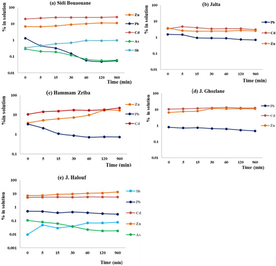 Results show that during the first cycle (0 min of stirring), Zn and Cd are characterized by extraction rates higher than those of Pb. The extraction rates of metalloids (As and Sb), which are detected only for the samples from Sidi Bouaouane and J. Halouf, are below those of Zn, Cd and Pb.