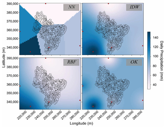 Comparison of all spatial interpolation methods utilized in this study (red markers show the location of all observation stations considered) for the same event.
