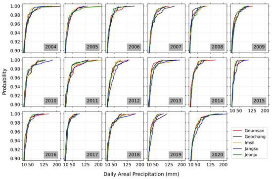 Occurrence frequencies of daily precipitation intensities observed at Geumsan, Geochang, Imsil, Jangsu, and Jeonju gauging stations from the year 2004 to 2020.