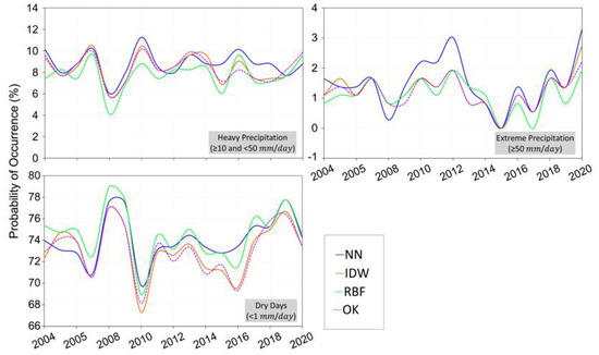 Probability of occurrence of dry days, days with heavy precipitation, and days with extreme precipitations based on the default NN-, IDW-, RBF-, and OK-based areal precipitations.