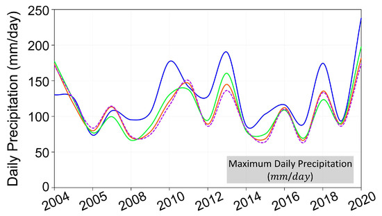 The available daily precipitation, minimum and maximum temperatures, relative humidity, wind speed, and solar radiation data from five nearby automated surface observing systems (ASOS) stations, from the years 2000 to 2020, were obtained from Korea Meteorological Agency (KMA; www.kma.go.kr; accessed on 1 June 2021) database. Table 1 summarizes the detailed information of the five ground observation stations utilized in this study. Based on the annual average precipitations summarized, Jeonju and Jangsu stations had the lowest and highest annual average precipitations, which are also located at the lowest and highest elevations; suggesting that orographic precipitation exists in these areas.