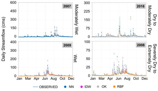 Finally, the comparison between the observed and simulated daily streamflow grouped according to SPI–12 classifications and the optimal interpolation method for each case at the Yongdam dam basin are summarized as follows: for moderately wet conditions, NN performed best; RBF for wet, severely dry, and extremely dry conditions; and OK or IDW for dry to moderately dry conditions.