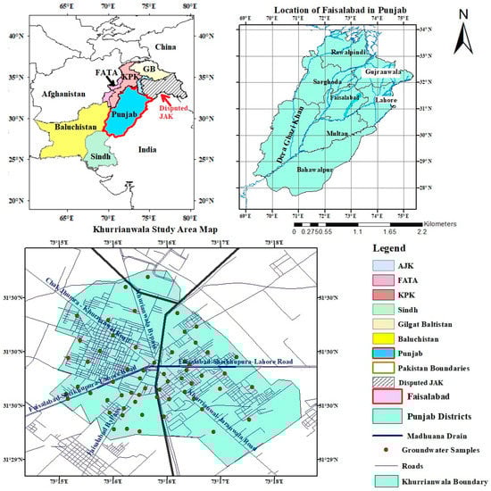 The evaluation of the quality of groundwater has become highly essential for the sustainable development of fresh groundwater aquifers due to the large number of industries in Faisalabad. The knowledge of the spatial distribution of environmental parameters is essential for evaluating the water quality [16]. Since monitoring is costly, particularly for large areas of groundwater, accurate and versatile instruments are required to assist with such monitoring strategies [17]. These issues can be solved by using modular tools, such as a geographic information system (GIS), as fewer observation wells are required to assess the groundwater quality of the entire area, and the potential cost is also minimized [18,19]. One of the most widely used methods to classify and reflect the water quality situation for a particular location is the GIS-based water quality index (WQI) [20]. A valuable method for water quality control is the mapping of water quality indices within the GIS. It helps to provide three-dimensional patterns in water quality variance to clarify the current situation concerning various parameters of the water quality investigated. Several researchers in different countries have applied WQI to evaluate the water quality of that region [21,22,23,24,25]. Different authors in Pakistan have also assessed groundwater quality maps using WQI. In Faisalabad, a few researchers, such as [4], have checked the groundwater quality in Chokera, which is the western part of Faisalabad, by applying WQI. However, there was no groundwater quality map developed for the eastern side of Faisalabad, where the Madhuana drain collects wastewater from textile mills in the Khurrianwala neighborhood. Most of the textile industries in this region do not have any treatment facility for wastewater and toxic wastewater, which is discharged into the Madhuana drain without any treatment, which seeps down and ultimately affects groundwater quality.