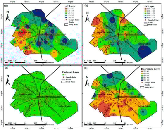 Spatial variability of pH (a), EC (b), carbonate (c), and bicarbonate (d) in groundwater.