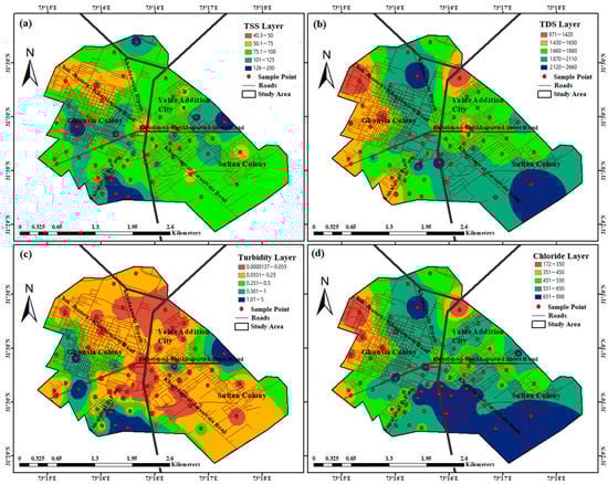 Spatial variability of TSS (a), TDS (b), turbidity (c), and chloride (d) in groundwater.