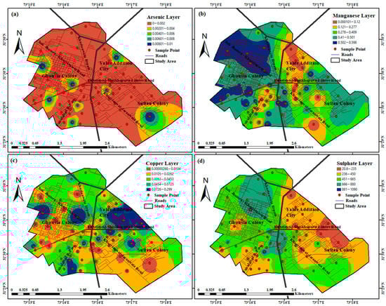 Spatial variability of As (a), Mn (b), Cu (c), and sulfate (d) in groundwater.