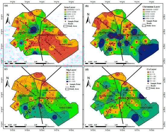Spatial variability of Fe (a), Cr (b), Mg (c), and Ca (d) in groundwater.