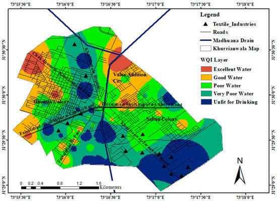 The resulting map of the WQI map made up of all parameter layers is shown in Figure 6. The resulting map showed that the water quality was fit for drinking purposes only in the Value Addition City and some areas near the Ghousia Colony. Around the wastewater outlet point of textile factories on the Khurrianwala–Jaranwala Road, Faisalabad–Sheikhupura Road, and Khurrianwala Bypass, the water quality was poorer. The major source of pollution is the Madhuana drain’s recharge mechanism, which transports 0.56 million m3/day of water. The main reason for the higher metal concentration in this area’s groundwater is that industrialization and urbanization have considerably increased the number of contaminants in the environment, which may be seeping from the soil. Heavy metals are found in water as a result of significant industries that operate at high temperatures, such as textile mills, dye textile units, spinning mills, and pharmaceutical companies. The sewage system and waste disposal are another important source of high concentrations. The resulting map can help the administration and authorities of Khurrianwala City to manage a disposal plan of sewage water into the Madhuana drain. It is overseen that only 5% of the groundwater samples represented “excellent water”, 17% represented “good water”, 32% indicated “poor water”, 29% indicated “very poor water”, and 17% water was unfit for drinking purposes (Table 4).
