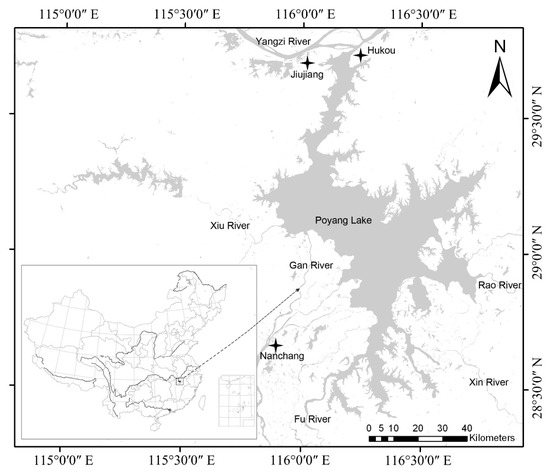 Poyang Lake is located between 28°22′–29°45′ N and 115°47′–116°45′ E. It lies in the northern part of Jiangxi Province, China, at the southern bank of the lower reach of the Yangtze River (Figure 1). The basin has an average annual temperature of 17 °C, annual rainfall of 1400–1900 mm, and a 240–330 day frost–free period [36,37]. It is 173 km long from north to south, and the mean width is 16.9 km from west to east, with the largest width being 74 km. The lakeshore is 1200 km long and covers a water area of 3569 km2 (when the water level at Hukou station is 17.9 m). Five rivers (Gan, Fu, Xiu, Rao, and Xin Rivers) drain through Poyang Lake into the Yangtze River at Hukou. Most of the annual precipitation falls between April and Jun, and during this period the lake fills up, with the water from the five rivers covering all of its bottomland and some marshlands. From July to September, water levels reach a peak with backflow from the Yangtze River. In October and November, the water surface subsides and vast tracts of flat grass-covered marshlands emerge above the water. The water body area varies greatly with fluctuations in its level throughout the year. This forms a special scenery of marshlands in winter and floods in summer [30,38,39] over the lake area.