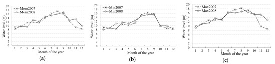 Monthly (a) mean, (b) minima, and (c) maxima of water level (m) between 2007 and 2008.