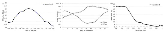 Temporal profile of water level data: (a) water level from 19 April to 25 May 2007; (b) comparison of water level in April 2007 and 2008; (c) water level from 4 September 2007 to 3 January 2008.