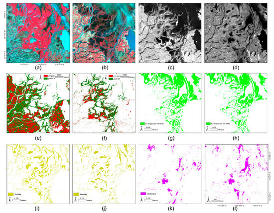 Beijing-1 images comprising first component of summer ASAR WSM PCA analysis and maps of five main PFTs from two classification methods. (a,b) Beijing-1 images acquired on 19 April and 17 October 2007, respectively; (c,d) PCA analysis of first component of summer and winter ASAR WSM image; (e,f) classification results of emergent aquatic macrophytes and giant C4 grasses by decision tree and rule-based methods; (g,h) classification results of C3 (sedges and forbs) by decision tree and rule-based methods; (i,j) classification results of floating aquatic macrophytes by decision tree and rule-based method; (k,l) classification results of submerged aquatic macrophyte by decision tree and rule-based methods.