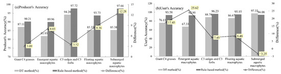 The producer’s accuracy from rule-based classification increased by 3.1% for giant C4 grasses, 8.0% for emergent aquatic macrophytes, 3.5% for C3 (sedges and forbs), 8.4% for floating aquatic macrophytes, and 12.3% for submerged aquatic macrophytes (Figure 9a). The greatest improvement occurred in the class of submerged aquatic macrophytes, with increased accuracy from 85.4 to 97.7% (Figure 9a). This class tended to have a high omission error and be misclassified with C3 (sedges and forbs) by the DT method (Figure 8k,l). However, the user’s accuracy for submerged aquatic macrophytes decreased slightly by 3.3% compared with the rule-based method (Figure 9b). The two lowest user’s accuracy values among the five aquatic PFTs by the DT method were for emergent aquatic macrophytes (67.3%) and giant C4 grasses (76.1%). It is evident from the confusion matrix and visual comparison of spatial distribution (Figure 8e,f) that the DT method could not distinguish these two PFTs from upland farmland due to their short water submersion time, similar moisture status, and NDVI values, whereas the rule-based method, which conducted land cover mapping using temporal Beijing-1 images, overcome this problem and increased the user’s accuracy by 25.6% for emergent aquatic macrophytes and 17.5% for giant C4 grasses.