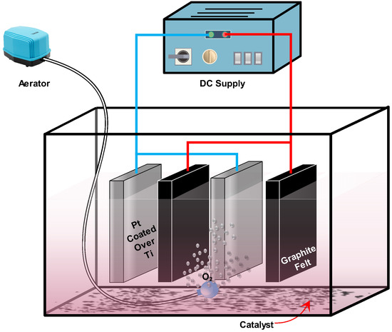 Electrolytic experiments were carried out in a reactor of 1 L capacity. A 1000 mL solution containing of 10 ppm RhB was prepared at the beginning of each experiment. Initial pH was maintained at 3 for all the experiments, except those in which the effect of different pH was examined. pH was adjusted using 0.1 N H2SO4 and 0.1 N NaOH. pH was monitored using a Laqua pH meter (Horiba scientific). Two anodes and two cathodes of size 5 × 8 cm with a 1 cm inner electrode spacing were used for the experiments. Using a commercially available fish aerator, a continuous supply of air was fed into the system until the end of the experiments. After an aeration time of 5 min, catalyst was added. The electrodes were connected to a DC power supply (make: Crown). The experimental setup is shown in Figure 1. Samples were collected at 15 min intervals and stored in the refrigerator in brown vials to avoid further degradation or reaction. The residual RhB present in each sample was measured using a UV/Vis spectrophotometer (UV-1900I, Shimadzu, Japan) at 555 nm (which is the peak wavelength of RhB). All the experiments were conducted at room temperature. The effect of different operational parameters such as pH, voltage, catalyst concentration, and pollutant concentration were also studied.
