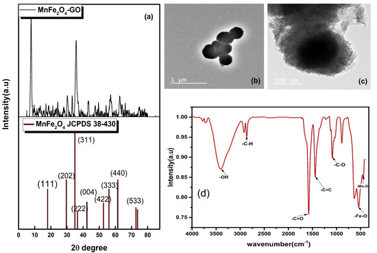 XRD pattern of MnFe2O4–GO (a) TEM images of MnFe2O4–GO (b), (c), FTIR spectrum of MnFe2O4–GO (d).