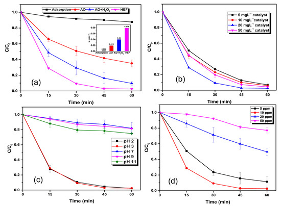 The catalyst dosage has a crucial role in the HEF process [52]. In order to optimize the catalyst dosage, HEF treatment was carried out by varying the catalyst dosage (5 mg L−1, 10 mg L−1, 20 mg L−1 and 50 mg L−1). As illustrated in Figure 3b, on increasing the catalyst dosage from 5 mg L−1 to 10 mg L−1, RhB removal slightly improved from 93.09% ± 0.0081 to 94.02% ± 0.0123. As, Fe2+ generation is less at lower catalyst concentrations, the production of hydroxyl radical is also less, which explains the lesser efficiency in degradation at 5 mg L−1 catalyst concentration [23,41,53]. When increasing catalyst dosage to 20 mg L−1, a sharp increase in pollutant removal was evident, as RhB removal reached 97.51% ± 0.0002 within 60 min. Whereas, further increase in catalyst dosage lowered the RhB removal (reduced to 95.81% ± 0.0066).When excessive catalyst concentration is present in the system, the generated hydroxyl radicals could be scavenged and could lead to hydroperoxyl radical formation which has less oxidation potential than •OH (Equations (5)–(7)) [23,53,54]. Thus, the optimized catalyst concentration is taken as 20 mg L−1 for all further experiments.