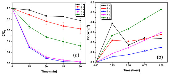 The energy consumption for the RhB removal via HEF is calculated for varying applied voltages (Figure 4b). On comparing different voltages, 3 V showed significant reduction in RhB concentration by utilizing the lower energy. In both higher and lower voltage conditions, energy efficiency was less. Higher energy consumption will increase the cost of the process and thus a voltage of 3 V was selected for further experiments [54].