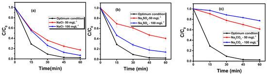 The effect of different anions such as chlorides, sulphates and carbonates on RhB solution at optimized conditions was studied. Figure 5 illustrates the effect of various ions on the degradation of RhB. 50 mg L−1 and 100 mg L−1 of each NaCl, Na2SO4 and Na2CO3 were added to the RhB solution.