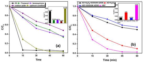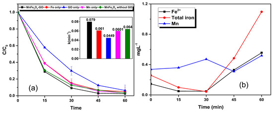 The individual contribution of Fe, Mn, GO and MnFe2O4 spinel structure in providing HEF activity were investigated using catalysts prepared under respective conditions by excluding other precursors involved. Because of the availability of numerous oxygen functional groups, large surface area, electrical conductivity and mechanical stability, graphene and GO are very promising support materials [69,70], and thereby enhance catalytic activity [71]. The enhancement in catalytic activity of the L–GO–ZnO composite on the photocatalytic activity of RhB was reported by Yaqoob et al. [10]. There are a few studies in the literature which report the catalytic activity of GO [72]. Thus, the role of GO alone is also examined to investigate the possibility of GO as a catalyst for HEF activity. Figure 7a depicts the different degradation rates of RhB obtained under each condition. From Figure 7a, it is clear that the catalyst works efficiently when it is in the form of spinel structure with GO support with a rate of RhB removal of 0.079 min−1. In the case of GO, Mn, Fe and MnFe2O4 without GO, the rates of RhB removal were 0.0449 min−1, 0.0601 min−1, 0.0610 min−1, 0.0640 min−1, respectively (inset of Figure 7a). The GO solely does not directly contribute to the HEF activity, as the RhB degradation in that case is similar to that of AO + H2O2 (0.04 min−1). Similar results were obtained by Yao et al. [71]. In addition, this study observed an additional benefit of GO in the catalyst composite development, as the GO support contributed to lowering the solvothermal synthesis duration. In the absence of GO, MnFe2O4 development required a minimum of 9 h, whereas in the presence of GO, proper catalyst development was observed within 6 h of solvothermal treatment.