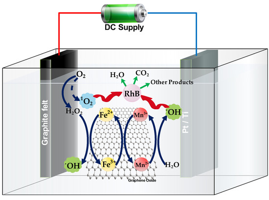 The mechanism involved in the HEF oxidation of RhB is given in Figure 8. The Fe2+ from the catalyst decomposes in-situ generated H2O2 to form hydroxyl radicals (Equation (5)) which degrade the RhB molecules into CO2, H2O and other byproducts. Mn metal present in MnFe2O4 strongly accelerated the H2O2 decomposition, as in Equations (12) and (13) [34,35]. The Fe2+ formation from Fe3+ occurred by electron loss (which is explained by Equations (1)–(3)). All the possible reductions of Fe3+ to Fe2+ and degradation occur at the cathode, as RhB is a cationic dye [54].