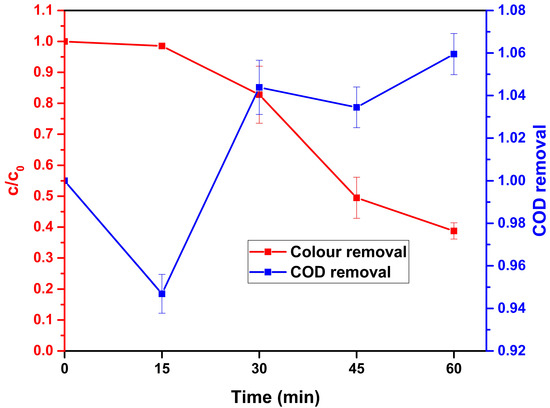 The wastewater collected was slightly acidic in nature (pH of 5.34) and had a conductivity of 13.2 mS cm−1. The optimized experimental conditions (pH-3, applied voltage of 3 V, catalyst concentration of 20 mg L−1) were applied to the textile wastewater for its effective treatment. The colour change was examined at a wavelength of 555 nm. As illustrated in Figure 9, colour reduction of 61.4% ± 0.061 was obtained after HEF treatment. The decolorization is caused by the breakdown of the dyes belonging to the chromogen group into its by-products [77]. Similarly, Nidheesh et al. [63] found 97.5% colour removal in textile wastewater by the HEF process. Colour removal in real textile water was investigated in batch and continuous modes by Nidheesh and Gandhimathi [77]. In the batch study, there was 83% colour removal and in the continuous study, 68% colour removal was obtained.