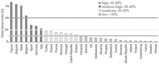 Many European countries are facing water stress, as evidenced by the conversion ratio from the total water extraction of a country to all renewable freshwater resources, highlighting the pressure exerted on water resources. Figure 1 shows the water stress index for each country [9]. High water shortage occurs when there are water losses greater than 75% of the renewable water resources; when water losses are greater than 60%, we have water shortages; when losses are over 25%, we have water stress. Extremely high water stress values greater than 80% are found in the following countries: Libya, Israel, Egypt, Jordan, Saudi Arabia, Turkmenistan, and Uzbekistan. Water stress is considered high for values in the range of 40–80%, affecting China, India, Afghanistan, and South Africa. Countries with low–moderate water stress (10–20%) are the United States and Kazakhstan; South America, Canada and Russia have low water stress (<10%).