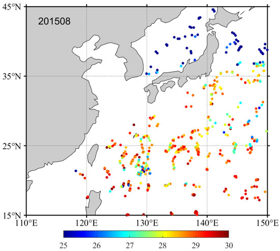 The Argo SST data adopted in this work were taken from the Coriolis Global Data Acquisition Center of France. The Argo program is part of the Global Ocean Observing System (GOOS) [20], covering the full month of August 2015 and the area of ECS. These data include delayed-mode profiles with a quality flag of 1. The Argo buoy returns a set of profiles every 10 days, and the shallowest water depth at which it collects temperatures is 4–5 m, with very little data in the 0-m layer. To obtain sufficient surface temperature information, the 0–5 m layer was selected as the validated surface measurements, following Marcello et al. [21]. Figure 1 illustrates the distribution of surface (0–5 m) depth Argo in the study area in August 2015.