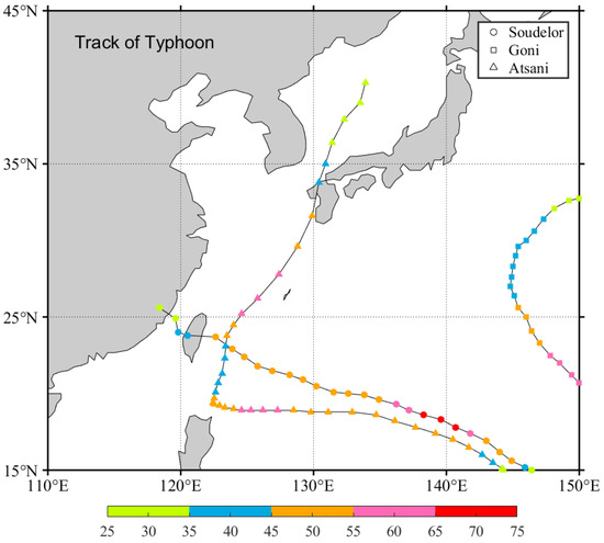 Typhoon track map for August in the study area (wind speed, colored shading; m/s). The circle represents Typhoon Soudelor (1–8 August, max radius of over 24 m/s winds 180 km), the square represents Goni (15–26 August, max radius of over 24 m/s winds 220 km), the triangle represents Atsani (16–26 August, max radius of over 24 m/s winds 240 km).