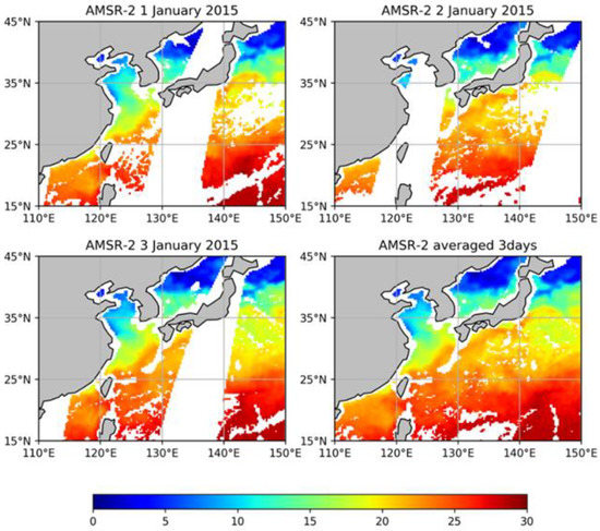 In order to get a better fusion effect, the selected SS data coverage should be as high as possible, since the data of one day alone often cannot reach the requirements. The MISST product determines the SST for one day in the middle of three consecutive days of remotely sensed observations by time smoothing. All daytime observations are adjusted and corrected by the wind speed at local time [1]. In this study, for MODIS and AMSR2 data to be fused, the SST data of three consecutive days are averaged to represent the SST of its second day, referring to the practice of MISST [1].