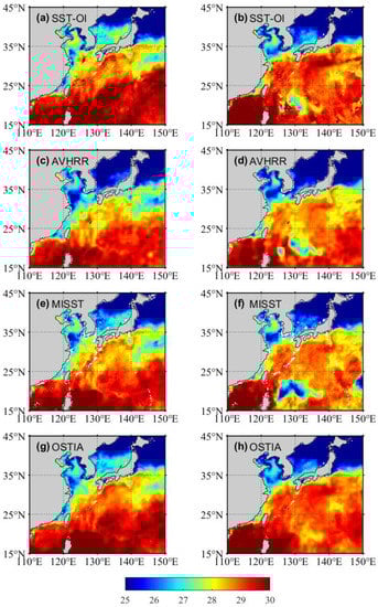 SST distribution of 4 different products in two situations (SST, colored shading; °C). (a) SST-OI product on the 15 August 2015 without typhoon impact, and (b) SST-OI product on the 20 August 2015 affected by typhoon. (c,d), (e,f) and (g,h) as in (a,b), but for AVRHH, MISST, OSTIA product respectively.