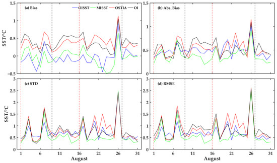 Day-by-day evolution of the statistical analysis of fusion products and Argo buoy SST match points. (a) Average of the mean deviation between the four products at the matching point and the buoy value, (b), (c) and (d) as in (a), but is the mean for absolute deviation, standard deviation, root mean square error respectively. The red vertical line indicates the date when the typhoon started to affect, and the black line indicates the date when the effect ended.