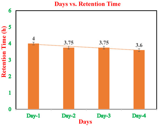 Results obtained from the VFCW system are shown in Figure 4 and Figure 5, respectively. The present study investigates the retention time of VFCW for 4 consecutive days. An optimum retention time of 3.5 h was obtained after four runs on different days (Figure 4).