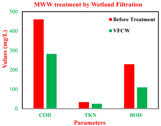 Results (Figure 5) show that the significant removal of BOD, COD and TKN from their initial values (BOD5 = 229 mg/L, COD = 460 mg/L, TKN = 34 mg/L) was achieved, and was found to be 110 mg/L, 282.5 mg/L and 25.6 mg/L for BOD5, COD and TKN, respectively. The possible mechanism of removal of BOD5 and COD was due to uptake by microorganisms and filtration for suspended solids removal, while for nitrogen it was due to uptake by plants [38]. At the start, growth of microbes was low, therefore the removal of both BOD5 and COD remained low. When microbes’ concentration became sufficient, removal increased significantly. The presence of microbes is possible both at the surface and in soil and gravel [39]. At the start, all the possible removal of BOD5 and COD was due to the removal of all suspended organic matter due to filtration of wastewater through VFCW. Moreover, the presence of rice husk in filtration media may also help to remove COD, BOD5, and TKN via adsorption.