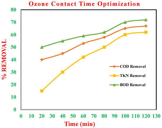 Figure 6 shows the contact time optimization results of simple ozonation. It was found that with an increase in contact time removal all three parameters increased, i.e., BOD5, COD and TKN. After 100 min, removal became constant. Therefore, 100 min was selected as the optimum contact time for ozonation experiments.