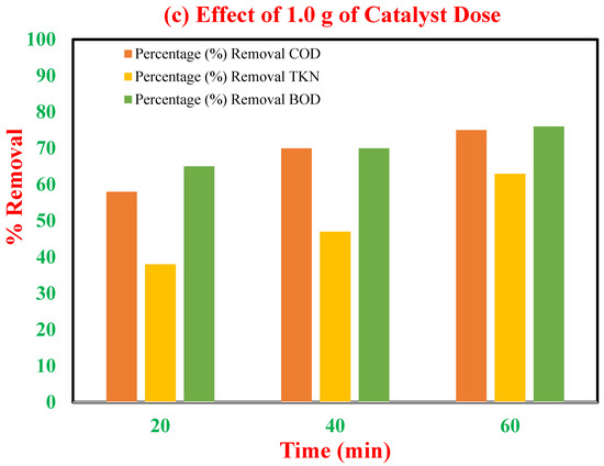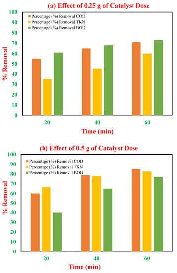Figure 6 exhibits the optimization of contact time for catalytic ozonation. The optimum time for the catalytic ozonation was found to be 60 min. It was found that after 60 min of contact time removal, all three parameters become constant and catalytic ozonation gave more removal efficiency at less time; the results are presented in Figure 7 for respective parameters (COD, BOD5, and TKN). Considering the economic factors, the optimum dose for catalyst was selected as 0.25 g (Figure 6).