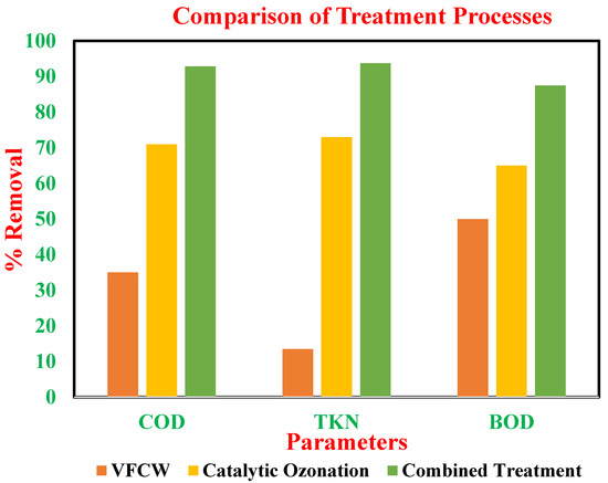 Figure 8 shows the comparison of BOD5, COD and TKN from VFCW, catalytic ozonation and combined VFCW/Co-zeotype/O3 process. It was found that concentrations remaining after combined treatment meet WHO guidelines for agricultural reuse. Overall removal of BOD5, COD, and TKN was found to be 87.5, 92.85, and 93.75%, respectively, in the case of the combined process, which was the highest as compared to single VFCW and catalytic ozonation treatments (Figure 8).