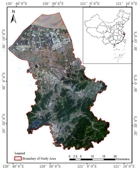 The study area of this article is Shangyu district (29°43′38″−30°16′17″ N, 120°36′23″−121°06′09″ E), which is located in the northeast of Zhejiang Province, China (Figure 1). The basic outline of Shangyu is a north–south rectangle, covering a total area of about 1403 square kilometers, of which the Qiantang River estuary is 212.3 square kilometers. Shangyu’s terrain is high in the south and low in the north. The area of the southern low mountains and hills is basically the same as that of the northern water network and plain. The north, with an average altitude of about 5 m, has rich cultivated land resources and dense urban distribution, which is the key area for land classification. The southern region is rich in forest resources, with a small number of residential and agricultural lands staggered among them. Shangyu is a rapidly developing district in China’s coastal area, with large areas of reclamation land and a fast rate of LULC change. The demand for regional economic development led to the change of land, mainly from agricultural land and forest land to construction land. In general, the types of land cover in this area are complex and diverse, and the areas of various types are unbalanced. The traditional classification methods are not applicable in this area. Therefore, in order to effectively carry out land-use planning, it is necessary to select appropriate data sources and classification methods to obtain better land-cover classification and change-detection results.