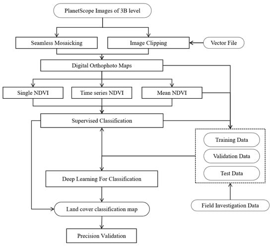 The process framework of this article is shown in Figure 2. The research is based on PlanetScope satellite remote-sensing images. After correction, seamless mosaic, clipping, resampling, and other preliminary data-processing operations on the original images, we build NDVI of the study area in 12 continuous months by using the red band and the near-infrared band. Then, through band-stacking of 12-month NDVI images, the data input in the subsequent classification can include the spatial position, spectral characteristics, and time series information. Image classification is realized by MLC and the deep-learning method in pixel-based direct classification. Finally, we analyzed the specific classification effect based on the overall classification results of the study area.