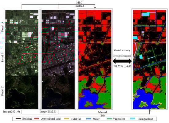 The classification strategy adopted is the pixel-based direct classification (DC) method. It is an effective method for processing time series data that such a scenario is not easy to model with expert knowledge but suitable for machine learning. Compared with the post-classification comparison method, it is more suited for LUCC because it can identify changes through only one stage without considering the error propagation from the wrong classification in each image [38]. The maximum-likelihood classification (MLC) based on statistical theory is a classification method used in the research; MLC is also called Bayesian classification. In two or more kinds of decisions of classification, this method uses a statistical method to set up a set of non-linear discriminant functions based on Bayesian Decision Criteria. Based on selecting training areas, assuming that each classification function corresponds to a normal distribution, the probability of the attribution of the area to be classified is calculated based on these statistics [39]. For this method, the results will be used for accuracy analysis on the one hand and will be used as the basis of deep-learning sample editing on the other hand.