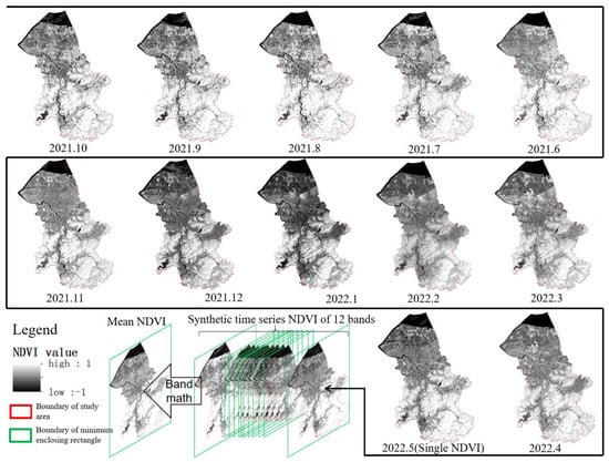 NDVI data were produced based on the above images. The step of cloud removal was omitted because the cloud coverage of PlanetScope satellite images that were screened was low, as has been mentioned previously. The red band (590~670 nm) and the near-infrared band (780~860 nm) of these processed images were applied to generate NDVI images. After the raster processing of multi-band synthesis, all NDVI datasets were stacked into a time-series NDVI product with 12 bands in chronological order. Through band math from time-series NDVI, the mean NDVI data were generated as a reference. Additionally, the single NDVI in May 2022 was selected as data for subsequent comparison. Both will be the input data to compare with the time-series NDVI.