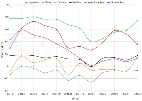 A total of 10 typical land-cover points of ground truth from agricultural land, buildings, water, vegetation, tidal flats, and changed land (all changed land selected were from agricultural land converted to buildings) were selected to build the value spectral for confirming whether their value ranges are different. The point data values of each land-use type were averaged. Finally, the annual NDVI value curves of typical features were obtained. In the NDVI value curve (Figure 7), there is a large degree of separation between time-series value curves for various types of land cover. The NDVI value of water roughly fluctuates between 0 and −0.3. The value of buildings is stable between 0 and 0.2. Tidal flats are just between the two, but the fluctuation is slightly larger. In a year, the NDVI values of these three kinds of features change slightly, while the changes in vegetation and agricultural land are relatively large. As Shangyu district has a subtropical monsoon climate, the rice has the phenological characteristics of double-cropping in one season, and the harvest period is around June and October, which leads to two troughs in the NDVI curve. The NDVI value of vegetation is the highest in most cases and decreases in winter, which also conforms to the vegetation growth dynamics. The average NDVI of the sample points from agricultural land to buildings indicates that the two types of surface features changed in a few months. The consumption date of ground feature type transformation can also be estimated roughly by using the spectral curve. For example, the spectral curve of changed land in the figure is different from other features between July and December, so it can be regarded as a transition time of its change. These situations show that the use of annual time-series NDVI is valuable for surface-feature classification.
