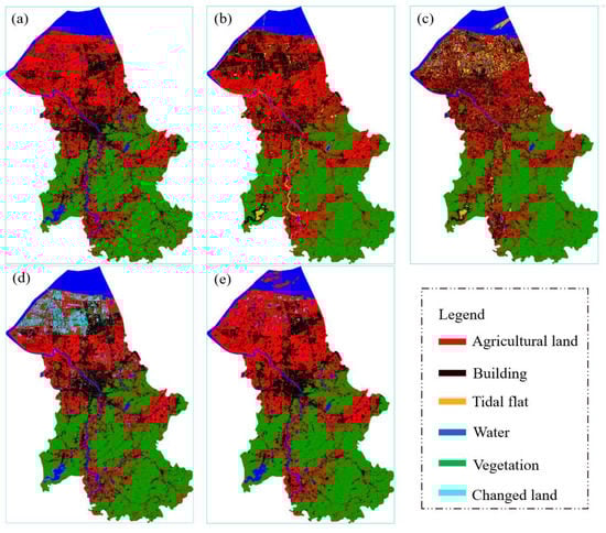 Referring to the current land-use situation in the study area and the new version of the national standard classification of land-use status [37] organized and revised by the Ministry of land and resources of China in 2017, the land-use classes were divided into six categories, including five classes of unchanging land cover, namely, agricultural land, buildings, water, tidal flats, and vegetation. Additionally, one special class for land-change detection is called changed land. The specific detail of these six classes is described in Table 2.