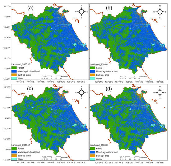 The Land-use maps in (a) 2000, (b) 2005, (c) 2010, and (d) 2020 for the study area.