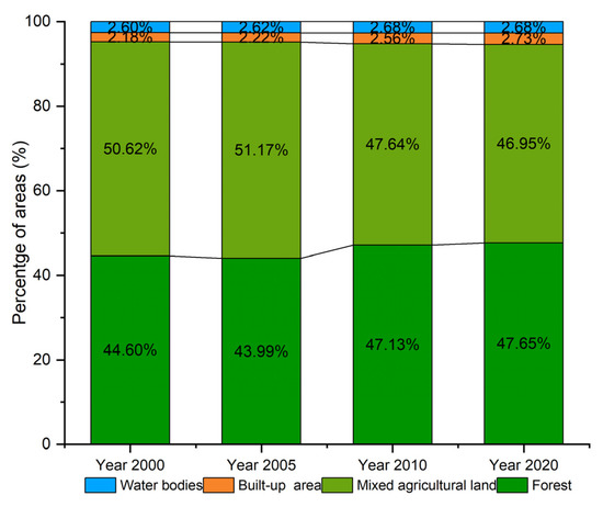 Figure 2 and Figure 3 indicated that built-up areas have gradually increased in this region, in which it has increased by 0.04% from 2.18% (2000) to 2.22% (2005). However, a remarkable increase has been observed with the built-up area increase of 0.34% in 2010, and it reached its peak at 2.73% at the end of the studied period (2020), corresponding to 68.03 km2 compared to 2000 (Figure 2 and Figure 3). Other land-use classes, such as forests, showed an upward trend by around 3% by the end of 2020 compared to 2000. On the other hand, mixed agricultural land has decreased over time, with a 4% decrease in its area by the end of 2020 (Figure 3).